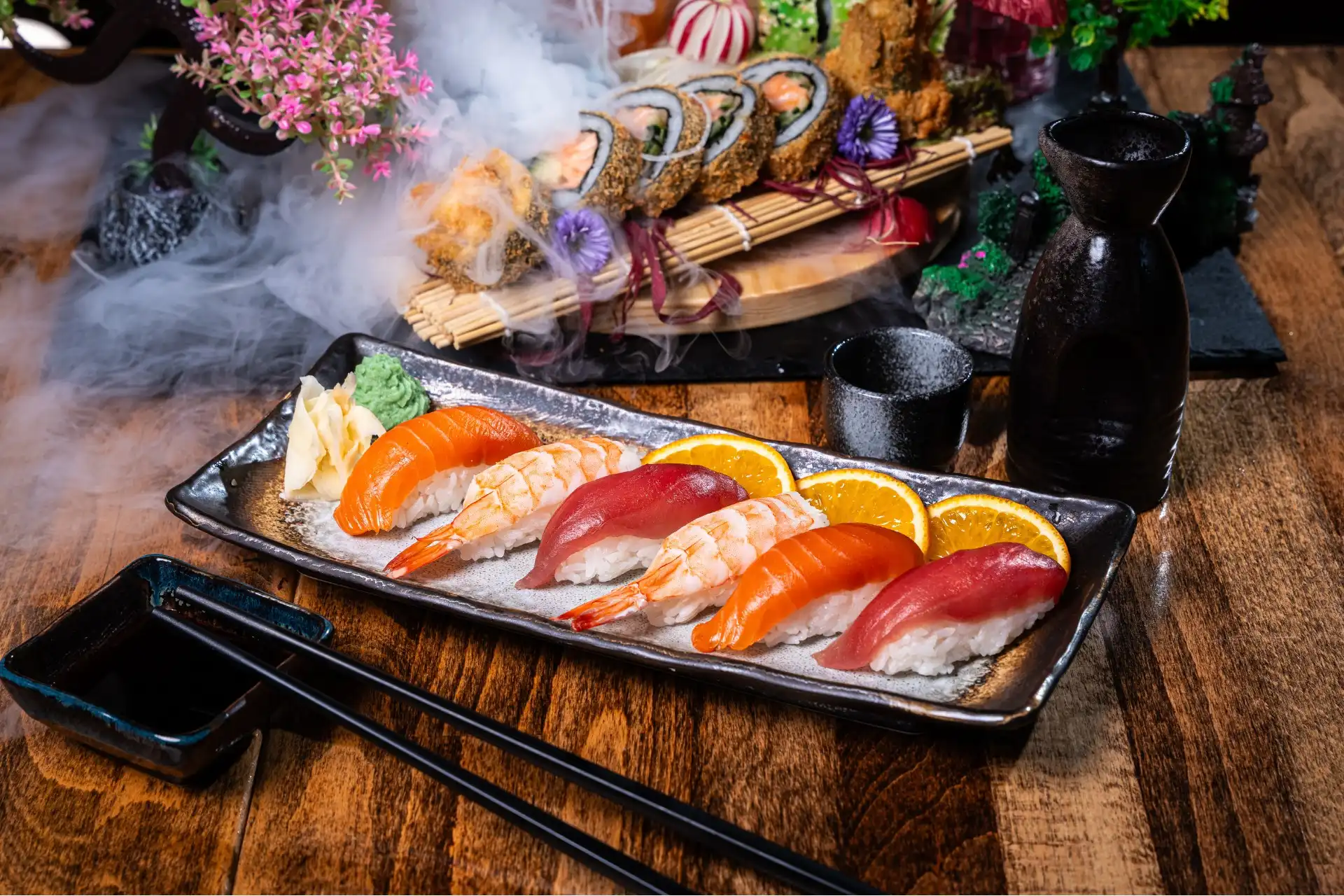 6 NETT Tempura, 6 Avocado Maki, 6 Sake Maki, 4 NETT Spezial, 4 Rainbow Spezial, 4 Salmon Spezial, 4 Salmon prawns on fire spezial, 4 Sake I.O, 4 Ebi Tempura I.O, 2 Sake on fire, 2 Tuna Nigiri, 2 Sake Nigiri, 5 Sake Sashimi